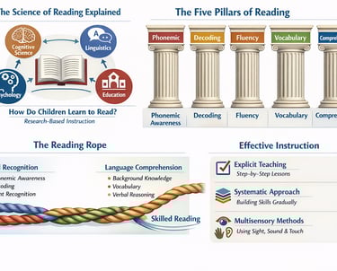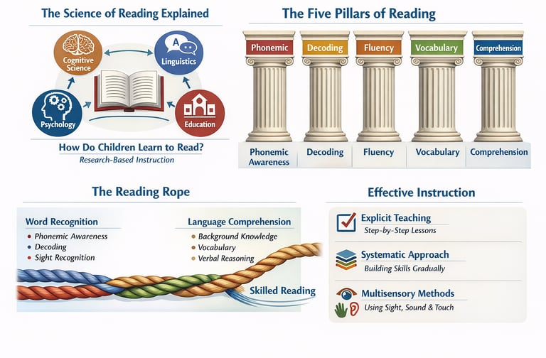 The Science of Reading refers to a body of research from cognitive science, linguistics, and education that explains how children learn to read. This research shows that skilled reading develops through explicit instruction in foundational skills such as phonemic awareness, decoding, fluency, vocabulary, and comprehension.