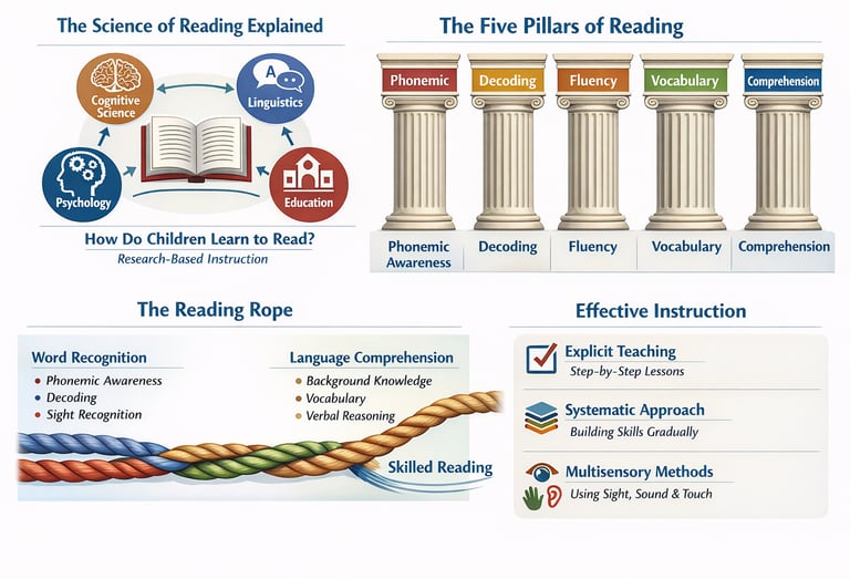 The Science of Reading refers to a body of research from cognitive science, linguistics, and education that explains how children learn to read. This research shows that skilled reading develops through explicit instruction in foundational skills such as phonemic awareness, decoding, fluency, vocabulary, and comprehension.